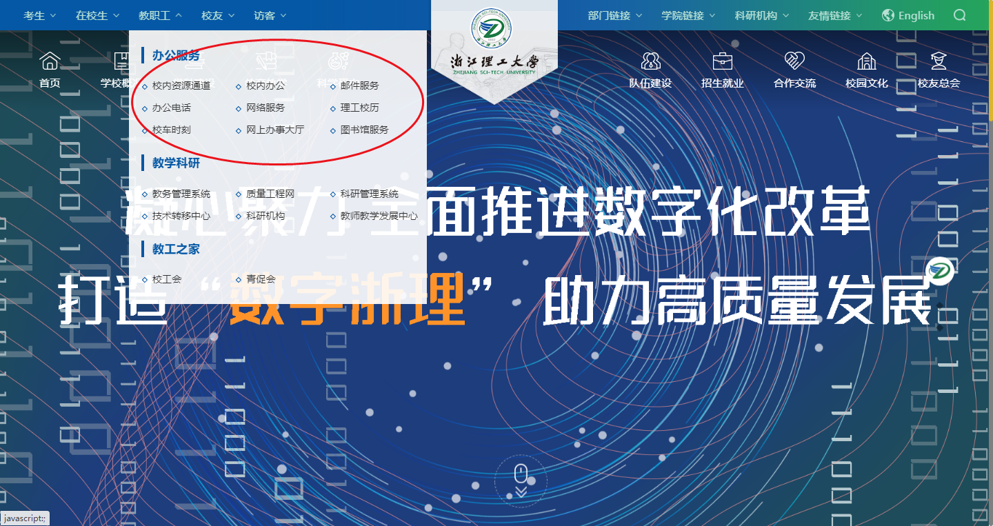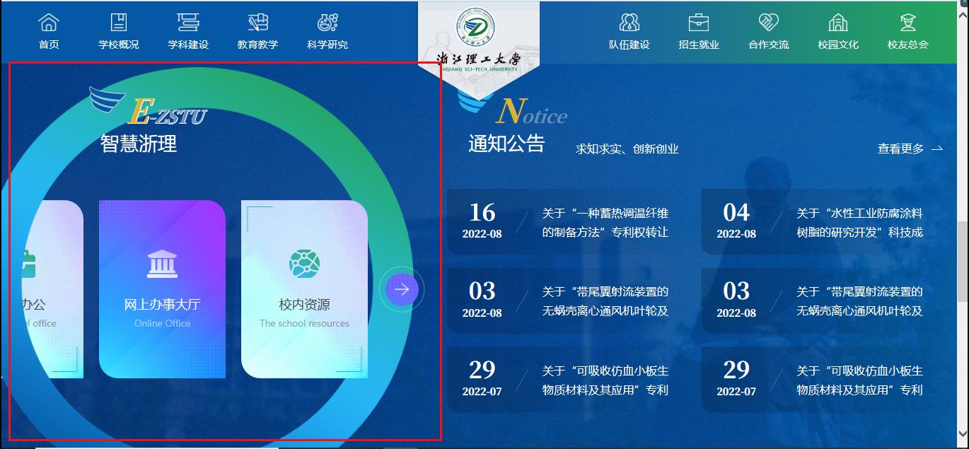 各位師生常用的校內資源(VPN通道)、網上辦事大廳、圖書館服務、郵件服務、新聞資訊等已整合在了主頁面的“智慧浙理E-zstu”板塊,實現了“一站式”服務。如下圖所示: