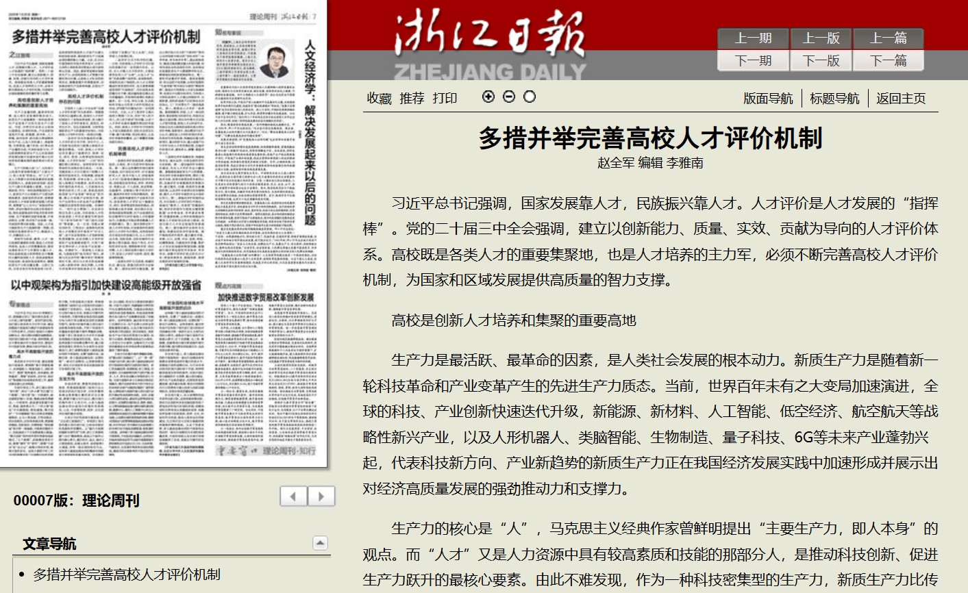 1月20日,《浙江日報》理論版頭條刊發浙江理工大學黨委書記趙全軍理論文章《多措并舉完善高校人才評價機制》。